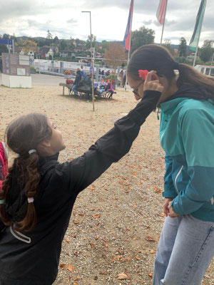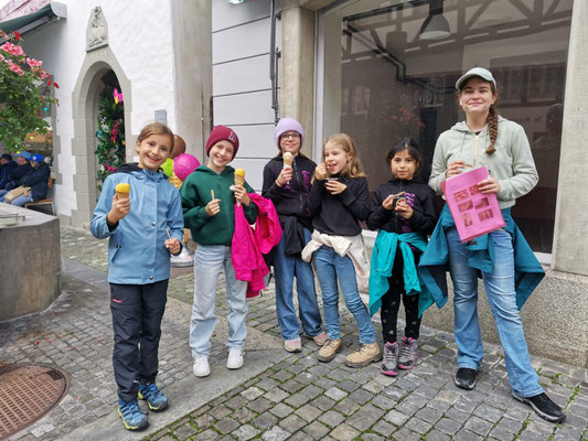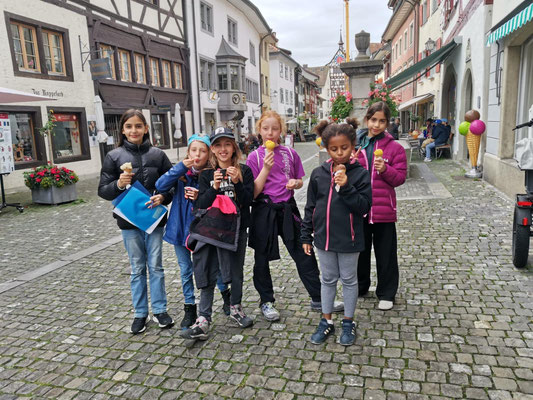 Die Vorfreude auf die Zimmer war riesig, doch wir mussten uns noch etwas gedulden. Die Zimmer waren vor 17:00 Uhr leider nicht bezugsbereit. Diese Zeit nutzten wir für einen spannenden Foto-OL durch den malerischen Ortskern von Stein am Rhein. In kleinen Gruppen lösten die Kinder verschiedenste Aufgaben: Wie viele Fenster hat das alte Gasthaus? Wie hoch ist die Brücke über den Rhein? Wie sehen Lavendel und Salbei aus? Und wo versteckt sich der Otter, der auf eine Hauswand gemalt ist? Aufgabe für Aufgabe ging es so quer durch die Stadt, bis zur letzten und wohl schwersten Aufgabe: Aus über 25 verschiedener Sorten, sollte man sich für nur eine Kugel Glace entscheiden. Nach dieser süssen Pause verging die Zeit wie im Flug und wir konnten endlich unsere Zimmer in der Jugendherberge beziehen.