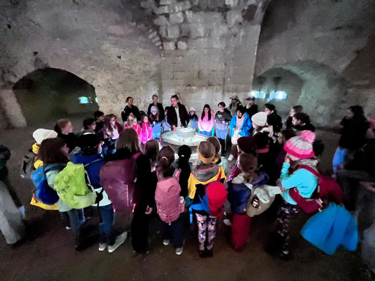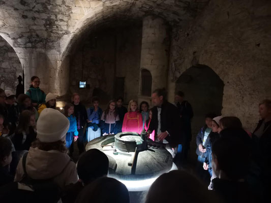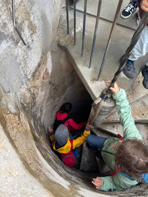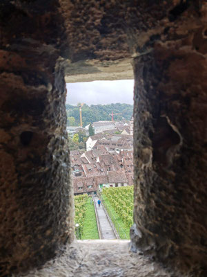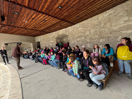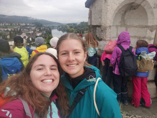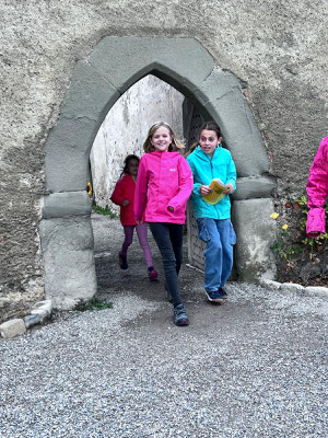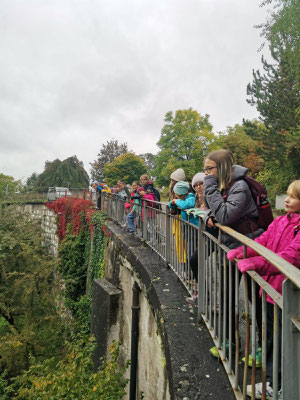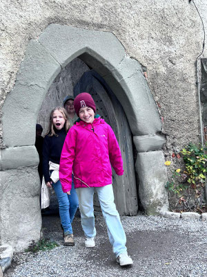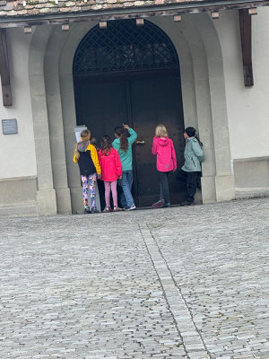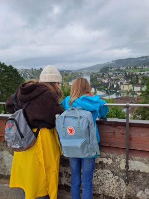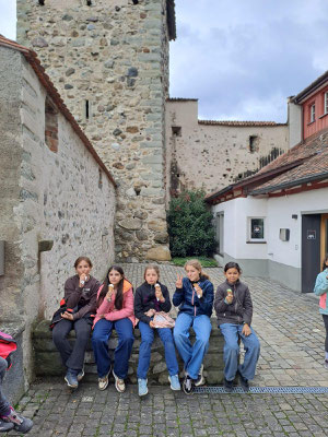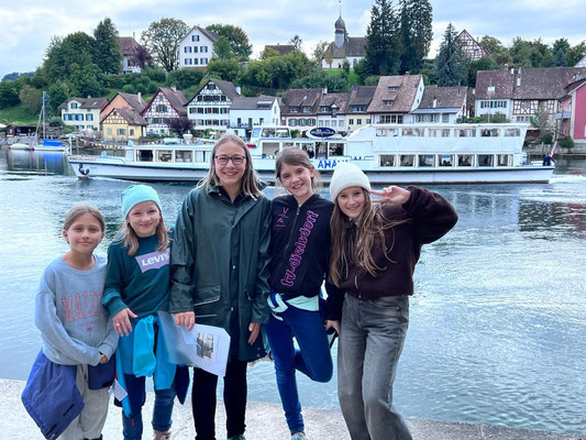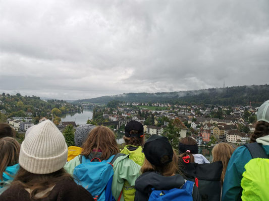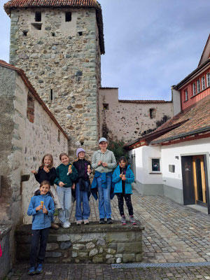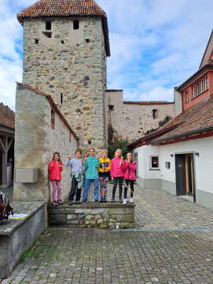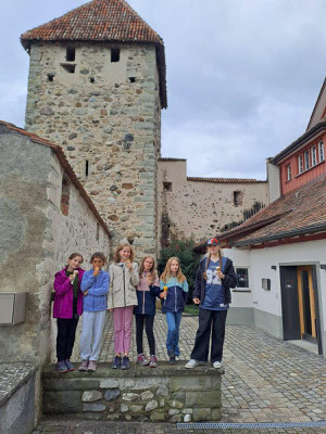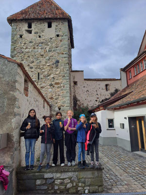 Am Fusse des Munots wurden wir herzlich von Sabine und Andi, den Munotwächtern, empfangen, die uns durch die historische Anlage führten. Dabei konnten wir den Munot und den alten Wehrgang von innen besichtigen. Besonders eindrücklich war der Aufstieg zum Turm mit der grossen Glocke, die seit Jahrhunderten jeden Abend um Punkt 21 Uhr von Hand geläutet wird. Von dort oben hatten wir eine tolle Aussicht über die Stadt, bevor wir entlang der Stadtmauer spazierten, vorbei an den besonderen „Haustieren“ des Munots. Denn wer auf einer Burg wohnt, hält sich natürlich keine Katzen oder Kaninchen, sondern: Dammhirsche. Die Führung war sehr spannend und so erfuhren wir viel über die Zeit, als Schaffhausen noch auf seine Stadtmauer und den Munot angewiesen war; zur Verteidigung, aber auch als Symbol der Sicherheit und Gemeinschaft.