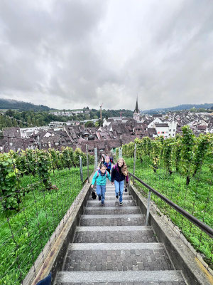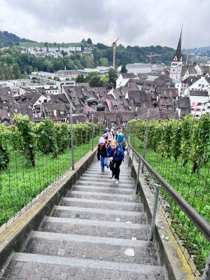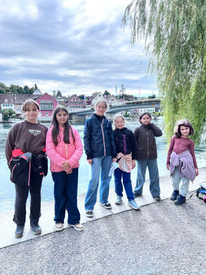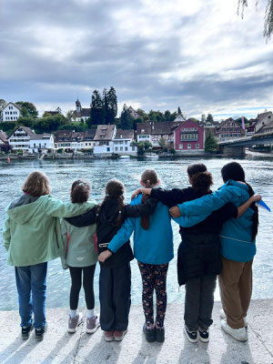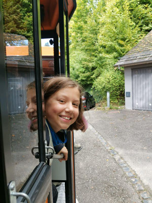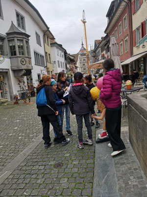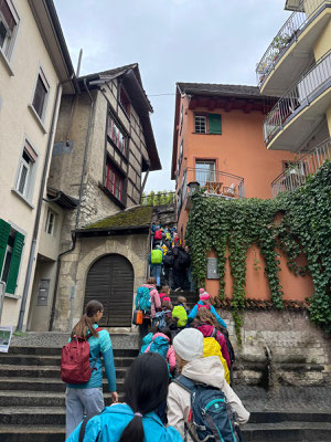 An der Bushaltestelle wurden nochmals alle durchgezählt, (immer noch alle da), und dann ging es mit Bus und Zug zurück nach Schaffhausen. Dort wartete die letzte Herausforderung der Reise: Nur drei Minuten Umsteigezeit, dazu eine Minute Verspätung, ein Gleiswechsel, und das mit 48 Personen. Auch hier hilft es, eine sportliche Reisegruppe zu haben: Und so haben unsere 7.-Klässlerinnen sich geschickt durch den Menschenslalom gekämpft, Treppe runter, Treppe hoch, Rucksack auf dem Rücken, Koffer in der Hand und hielten uns anderen die Türen auf. (Für den nächsten Fitnessparcours am Jugendsporttag ist also schonmal geübt.)