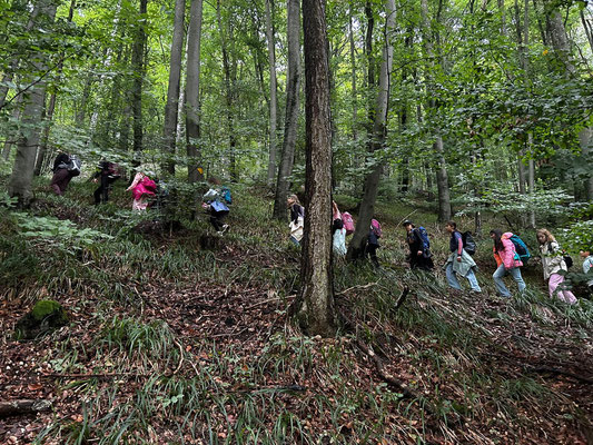Unser Ziel war die Burg Hohenklingen, die wir schon von der Jugendherberge aus sehen konnten. Die Entfernung war zwar überschaubar, doch die Burg thronte hoch über dem Ort. Und zunächst führte der Weg vom Ziel weg, hinein in den Wald. Doch langweilig wurde es auf dieser Wanderung keinesfalls: Mit 41 Mädchen unterwegs gibt es immer etwas zu tun oder zu entdecken: Wie kann man mit einem Grashalm pfeifen, wo findet man die besten Wanderstöcke und welches Tier wurde sich ausgedacht? So merkten viele gar nicht, dass wir uns langsam von hinten an die Burg heranschlichen.