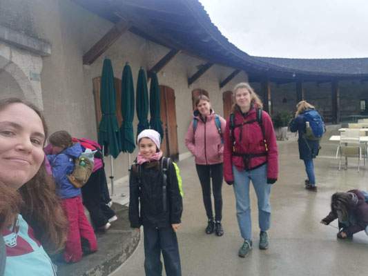 Dort hiess es: alles regensicher verpacken – Kinder ebenso wie Rucksäcke – und dann einmal quer durch die Altstadt zum Restaurant Güterhof, wo wir unsere grossen Gepäckstücke deponieren durften. Für den ersten Programmpunkt brauchten wir nur den Tagesrucksack, denn es ging hinauf zum Munot, der beeindruckenden Befestigungsanlage der Stadt Schaffhausen.